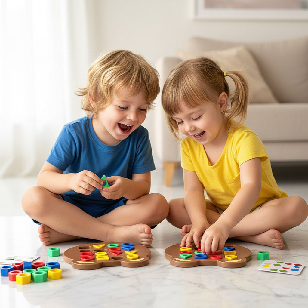 Dit sorteerspel nodigt uit om samen te spelen en elkaar uit te dagen. Door kaarten te matchen en als eerste de juiste vormen te plaatsen, oefent je kind continu zijn observatievermogen en reactievermogen.